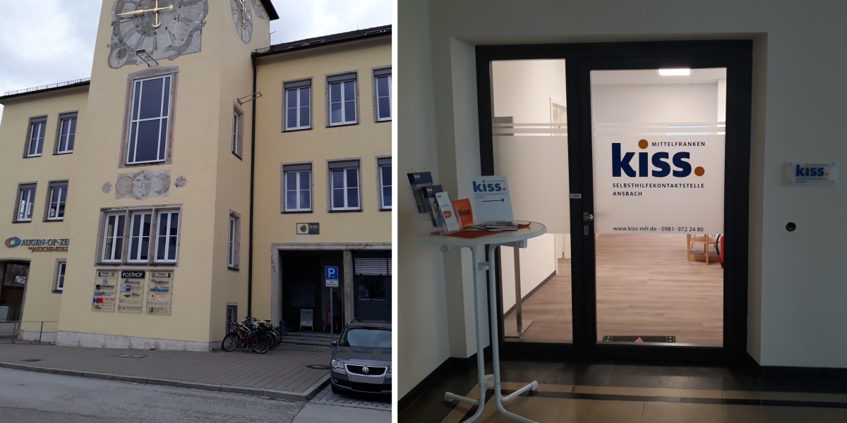 Sie finden die Kontakt- und Informationsstelle für Selbsthilfegruppen in Mittelfranken (Kiss) im Postgebäude, Bahnhofsplatz 8, 91522 Ansbach. Der Haupteingang hat einige Stufen, ein behindertengerechter Zugang ist von der Bahnhofstraße aus möglich. Parkmöglichkeit besteht (ab 18.00 Uhr kostenlos) direkt vor dem Gebäude oder in der Bahnhofstraße entlang des Hofgartens.